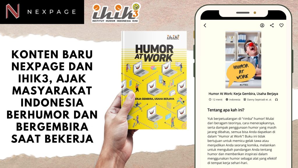 INDONESIA, 28 JULI 2023 – NexPage, aplikasi ponsel pertama di dunia yang menyediakan ringkasan buku nonfiksi yang telah diterjemahkan, kini berkolaborasi dengan Institut Humor Indonesia Kini (IHIK3), untuk meluncurkan ringkasan buku berjudul “Humor at Work: Kerja Gembira, Usaha Berjaya”, yang pertama kali diterbitkan pada tahun 2022.